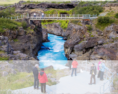 Börja dagen med ett besök vid vattenfallet Hraunfossar som består av många små vattenfall som rinner ut från lavafältens väggar och ner i floden Hvitá.