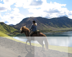 Ni fortsätter ritten in bland fjällen. Passerar sjön Álftavatn och det markanta fjället Laufafell och tar er genom en svart lavaöken fram till fjällstugan i Landmannahellir. Turen leder er genom den fascinerande dalen Reykjadalur med sina varma källor, små gejsrar och färggranna fjäll. Dagen avslutas i Landmannahellir, där ni övernattar de kommande två nätterna. (40 km)