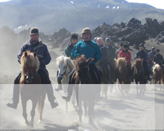 Ni lämnar vackra Landmannahellir och rider ner från fjällen, norr om vulkanen Hekla. En öken av svart aska och lätt pimpsten vittnar om Heklas många utbrott. Hekla är Islands mest aktiva vulkan. Sommarhusen i Rjúpnavellir blir första steget tillbaka mot civilisationen, där ni övernattar alldeles under vulkanen. Varma duschar finns på plats. (35 km)