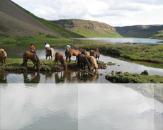 Ni rider längs mjuka ridvägar idealiska för tölt, islandshästens speciella gångart. Från bördig jordbruksbygd tar ni er upp mot fjällen Gæsafjöll och tillbringar natten i fjällstugan vid Theistareykir. Genom ett område täckt av sprickor efter jordbävningar och vulkanisk aktivitet leder vägen mot sjön Mývatn, där kokande lerkratrar och märkliga lavaformationer påminner er om den vulkaniska kraft som döljer sig under marken. Här finns möjlighet till ett avslappnande utomhusbad i geotermiskt uppvärmt vatten.